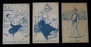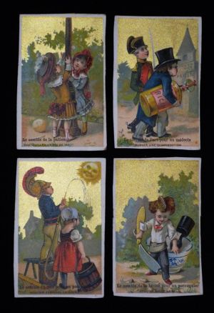 3 chromos publicitaires (6,6 x 10,1 cm) pour les moka et chicorées Joseph Lervilles, représentant des devinettes ; quelques légères marques d'usage sur les vignettes brunies, par ailleurs bon...