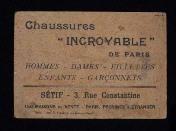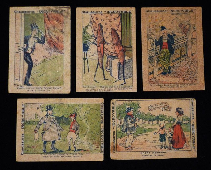 5 chromos publicitaires (5,5 x 9,5 cm) pour les chaussures "Incroyable" représentant des devinettes ; vignettes brunies, quelques marques d'usage, état moyen.