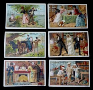 6 chromolithographies publicitaires (10,9 x 7,1 cm) éditées par la marque Liebig, série complète de devinettes comprenant les vignettes suivantes : Cherchez le batelier ; Cherchez la belle-mère...