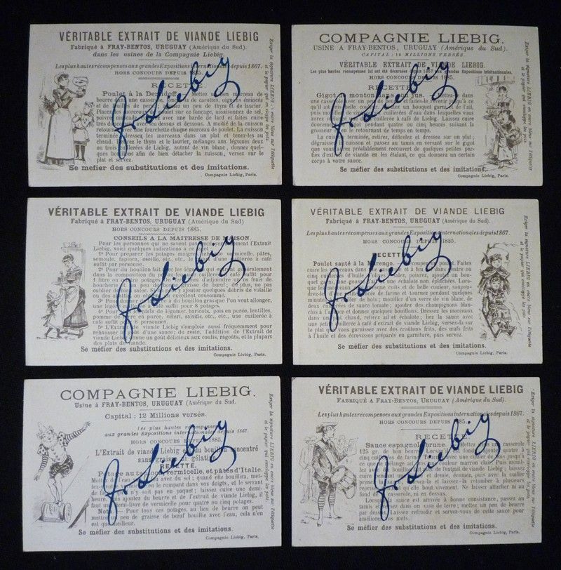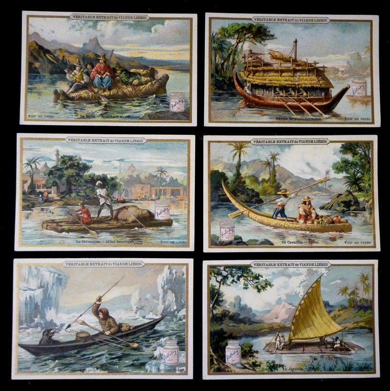 6 chromolithographies publicitaires (11 x 7,2 cm) éditées par la marque Liebig, série complète représentant diverses embarcations du monde, comprenant les vignettes suivantes : La balsa - Amérique méridionale ; Bateau de plaisance indou ; La catimaron - Indes Orientales ; Le Cavallito - Pérou ; Canot de pêche groenlandais ; La Jangada - Brésil ; très bon état.