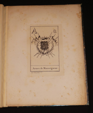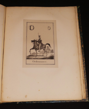 RARE. sans date (vers 1825). In-folio (29,4 x 37 cm), reliure demi-chagrin, dos à 5 nerfs orné du titre doré, plats de papier à la cuve, couverture lithographiée conservée, ex-libris d'Aubry Vitet au 2e plat, ouvrage imprimé par l'imprimeur-lithographe Villain, 24 larges feuillets de fort papier vélin montés sur onglet, avec au centre une lithographie sur Chine finement réalisée. Chaque lithographie comporte en tête l'initiale et sa minuscule, en pied la légende, et l'illustration au centre. Après le A, pour les 'Armes de Monseigneur', on retrouve principalement des objets accompagnant les militaires et quelques hommes, en pied ou à cheval. L'ouvrage ne comprend ni J, ni W, et le X, bien que présent, ne correspond à aucun mot particulier. Ce rare alphabet fut dessiné pour le jeune Duc de Bordeaux, Henri de Bourbon, Comte de Chambord (Paris 1820-1883 Autriche), prétendant au trône de France et fils de Charles Ferdinand d'Artois et de Marie-Caroline de Bourbon-Siciles ; frottements aux mors et coupes, dos passé, quelques rousseurs et mouillures marginales à l'intérieur, bel exemplaire.