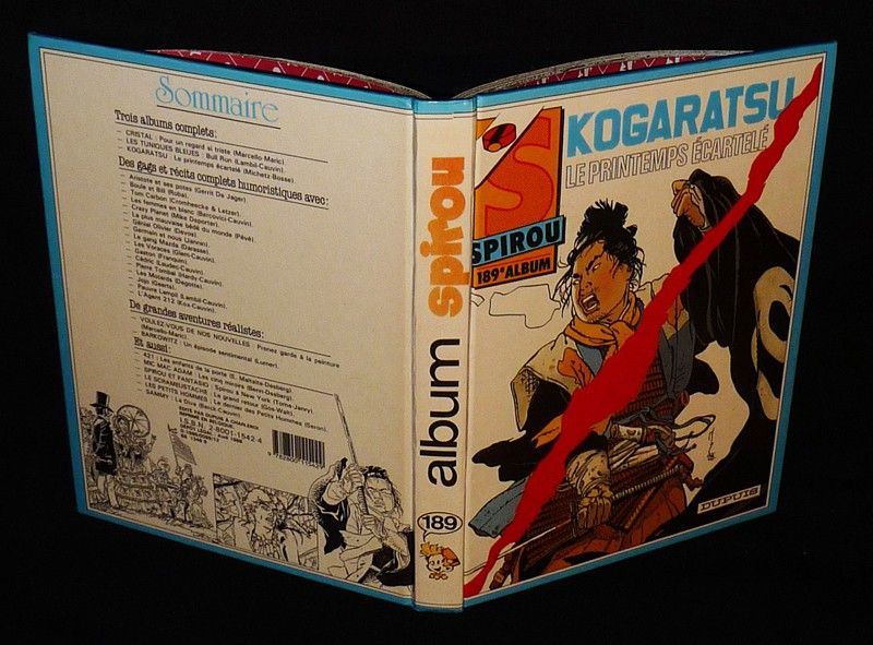 In-4 (21 x 27,2 cm), album cartonné, 1er plat illustré, album n°189 du journal Spirou, du n°2556 (7 avril 1987) au 2565 (9 juin 1987), avec le "Journal de Gaston" supplément au n°2560 ; quelques légères rayures aux plats, dos insolé, par ailleurs bon état général.
