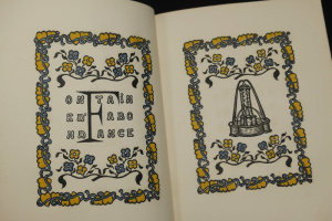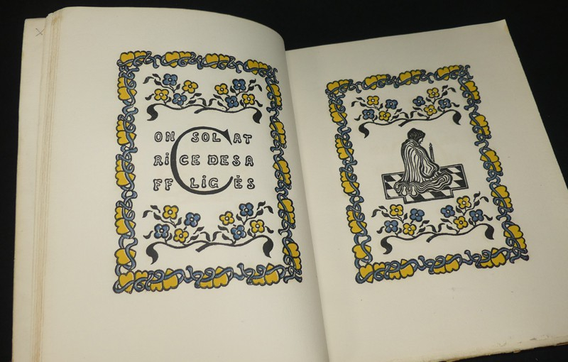 Rare tirage de tête dont les gravures sur bois, mises en couleurs, sont réalisées sur une face des feuillets de papier Hollande. In-4 (26,8 x 21,2 cm). 58 feuillets. Abécédaire entièrement orné, dessiné et gravé par le poète symboliste belge Max Elskamp (1862-1931). Tirage limité à 215 exemplaires : 5 sur Japon, 10 sur Chine, 100 sur Hollande et 100 sur vélin. Un des rares exemplaires sur Hollande n° 58. Est jointe, une lettre de l'éditeur G. Van Oest de Bruxelles, datée du 6 juin 1921, adressée à un ambassadeur et relative au livre dont Elskamp vient de retrouver deux exemplaires ; dos jauni, couverture légèrement salie, intérieur très frais, bon exemplaire.