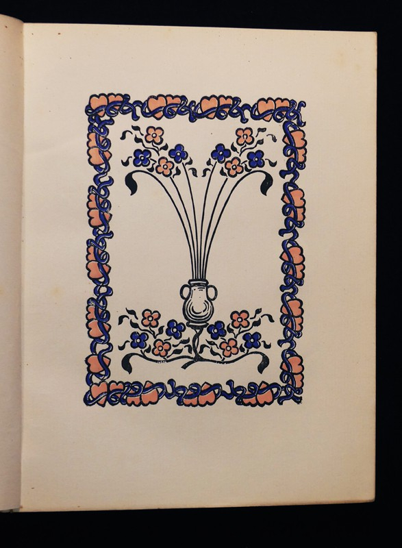 RARE. L'Alphabet de Notre-Dame la Vierge. Édition du Conservatoire de la tradition populaire. Anvers, 1901. In-4 (26,8 x 21,2 cm), broché, 29 feuillets doubles repliés sur eux-mêmes, couverture de papier vélin rempliée. Abécédaire entièrement orné, dessiné et gravé par le poète symboliste belge Max Elskamp (1862-1931). TIRAGE LIMITE à 215 exemplaires : 5 sur Japon, 10 sur Chine, 100 sur Hollande et 100 sur vélin. Le présent exemplaire est le n°184 sur vélin. Chaque page présente un encadrement de rubans bleus et coeurs roses, avec pour chaque lettre de l'alphabet le nom d'un symbole religieux, (Arche d'Alliance, Bâton du pèlerin, Consolatrice des affligés, etc.) dont l'initiale est placée au centre de la page, avec en regard un bois gravé illustrant ces symboles ; rares et pâles rousseurs, par ailleurs intérieur très frais, bel exemplaire.