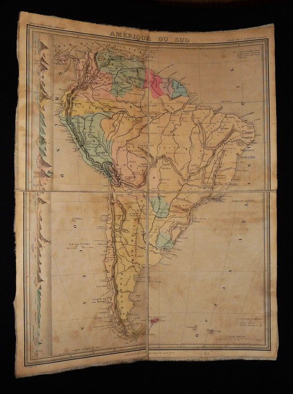 Carte entoilée d'Amérique du Sud (41 x 52 cm), sans date (XIXe siècle), échelle 1:16,835,000 ; quelques traces et marques d'usage, assez bon état général.