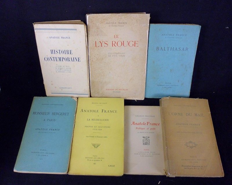 Lot de 7 ouvrages in-8 (14 x 21 cm. max.), dos brochés, "Le lys rouge" (253 pages - bois couleurs de Paul Colin), "Histoire contemporaine" (contient 4 récits - 791 pages - 1948 - couverture rempliée), "L'orme du mail" (336 pages), "Monsieur Bergeret à Paris" (404 pages - 1927), "Balthasar" (257 pages), "Anatole France à La Béchellerie - Propos et souvenirs 1914-1924" (268 pages - 1924), "Anatole France, politique et poète (à propos d'un jubilé) (54 pages - 1924) ; certains dos plissés / incurvés, coiffes et mors frottés, plats un peu piqués, rousseurs dans un livre, assez bon état d'ensemble pour ces livres anciens.