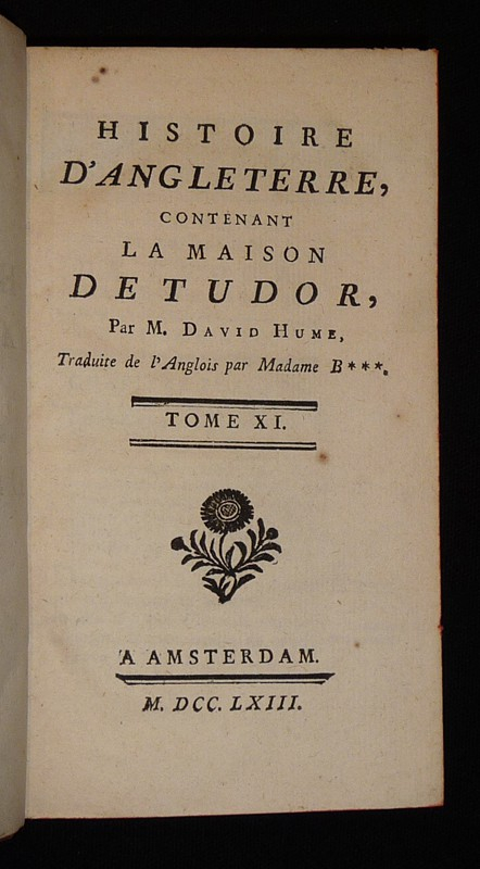 In-12 (10,5 x 17 cm), reliure plein veau, dos à 5 nerfs ornés de caissons dorés, d'une pièce de titre et de tomaison, tranches rouges, 395 pages, tome 11 de l'Histoire d'Angleterre de Hume, et cinquième partie de celle de la Maison de Tudor ; petits trous au dos en queue et au mors supérieur, épidermure au premier plat en queue et au quatrième plat en tête, par ailleurs assez bon état général.