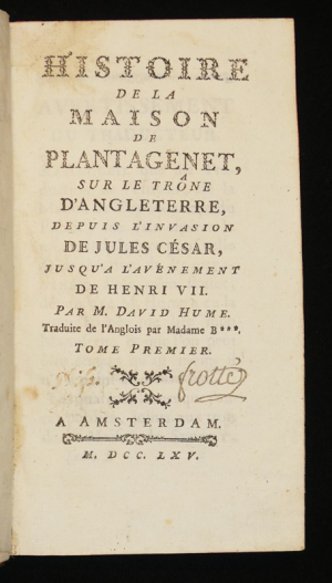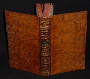 In-12 (10,5 x 17 cm), reliure plein veau, dos à 5 nerfs ornés de caissons dorés, d'une pièce de titre et de tomaison, tranches rouges, xxiv-332 pages, tome 7 de l'Histoire d'Angleterre de Hume, et première partie de celle de la Maison de Tudor ; coiffe supérieure usée, coins frottés, par ailleurs bon état.
