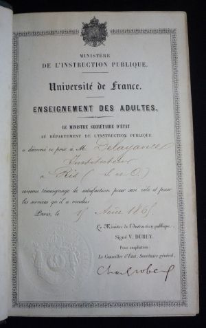 In-8 (14,3 x 22 cm), demi-chagrin, plats de percaline, dos à 4 nerfs orné de caissons dorés, 534 pages, belle page de prix avec le tampon sec impérial, illustrations en noir ; marques de frottement sur les plats, coins et coupes, assez bon état général.
