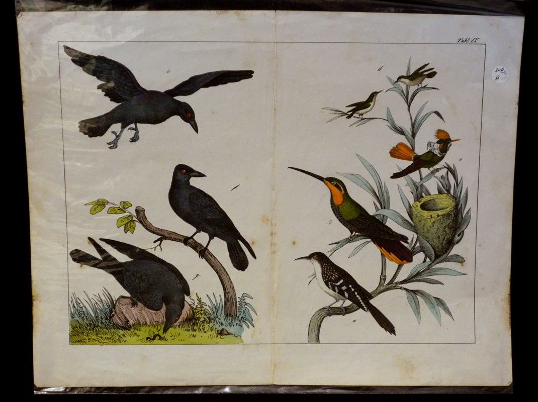 Gravure en couleurs (35,5 x 26 cm sur support 42 x 32 cm), non légendée, représentant divers oiseaux ; pliure au centre, quelques petites traces et marques d'usage, assez bon état.