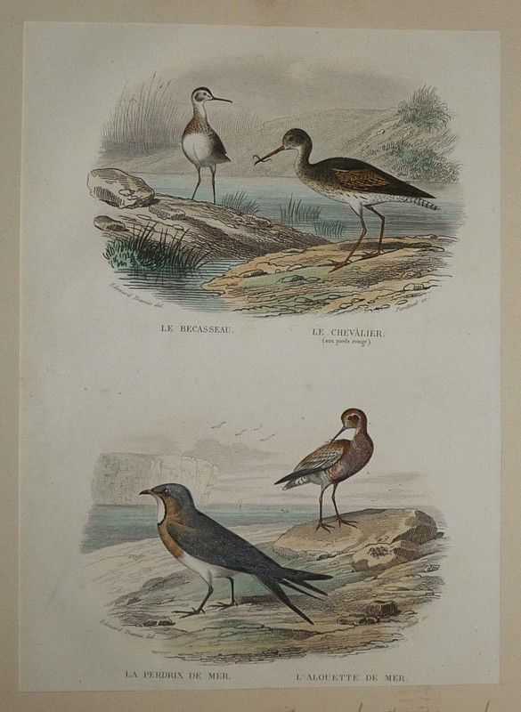 Gravure de Traviès pour illustrer Buffon (fin XIXe siècle) : Bécasseau - Chevalier (aux pieds rouges) - Perdrix de mer - Alouette de mer