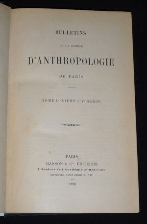 In-8 (15,5 x 22,2 cm), reliure pleine toile, XXXIX-731 pages, illustrations en couleurs, suivi de la "Table générale des publications de la Société d'Anthropologie de Paris depuis sa fondation (1860-1899)" (240 pages) ; petite déchirure à la coiffe supérieure, tranches brunies, bon état général.
