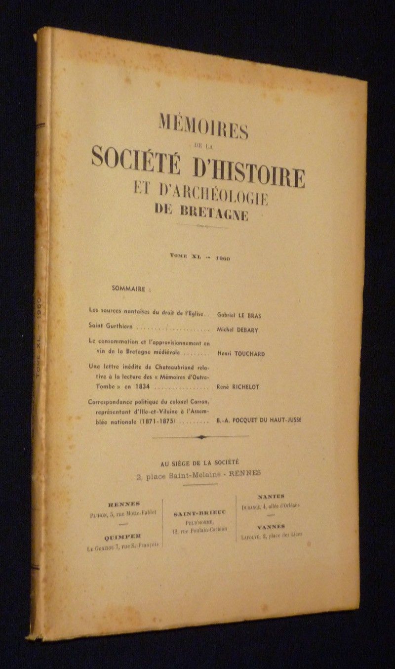 In-8 (16,3 x 25 cm), broché, 210 pages, Tome XL des Mémoires de la Société d'Histoire et d'Archéologie de Bretagne (année 1960) ; quelques petites rousseurs sur le premier plat et le dos, par ailleurs bon état général.