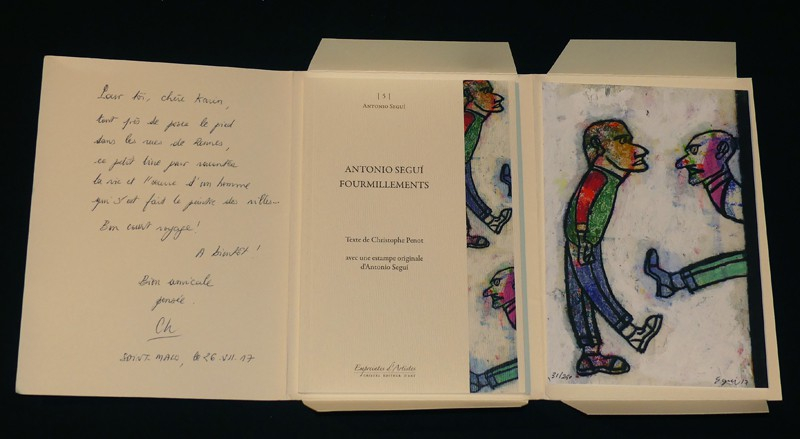 In-8 (14 x 21 cm), cinquième titre de la collection "Empreintes d'Artistes", portfolio contenant un livre de Christophe Penot et une estampe originale d'Antonio Seguí, chaque livre a été numéroté avant d'être signé par l'auteur, tandis que chaque estampe est numérotée et signée à la main par l'artiste. Cet exemplaire, qui porte le n°31 (sur les 250 imprimés sur vergé ivoire clair) comporte en outre un bel envoi de l'auteur ; très bon état général.