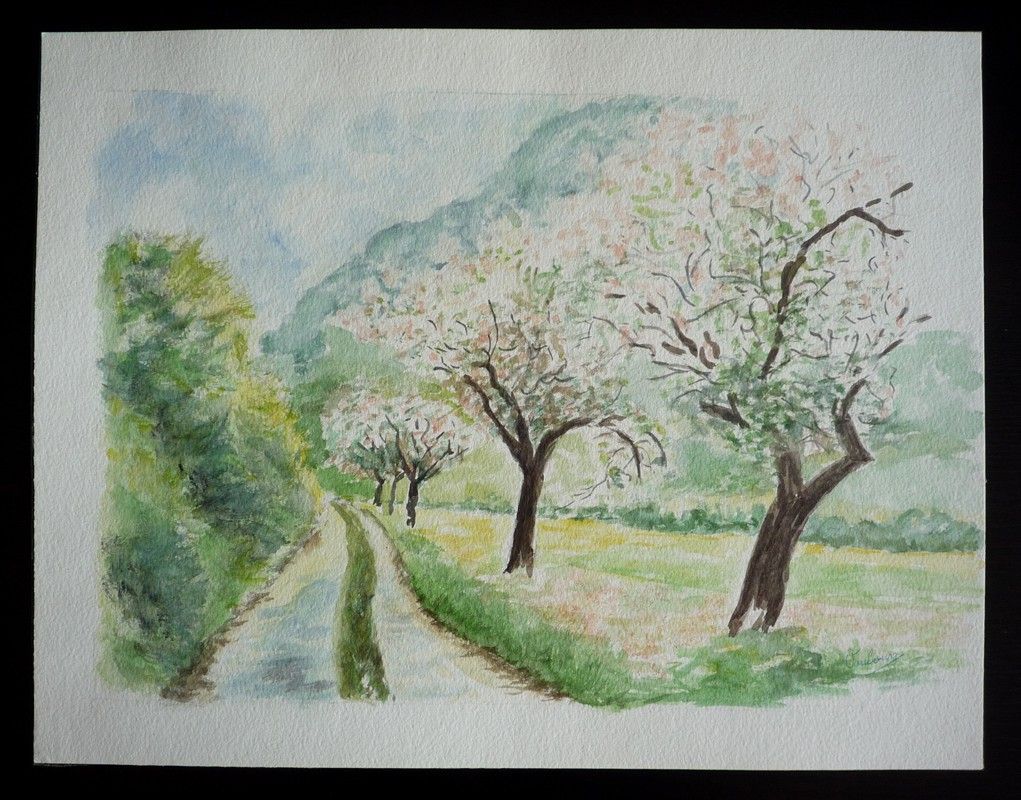 Aquarelle originale de Vaubourg : Chemin au printemps