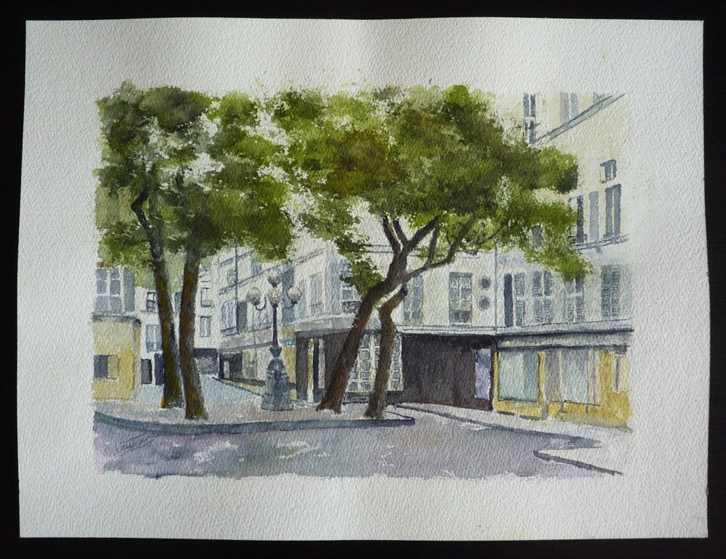 Aquarelle originale de Vaubourg : Place arborée en ville