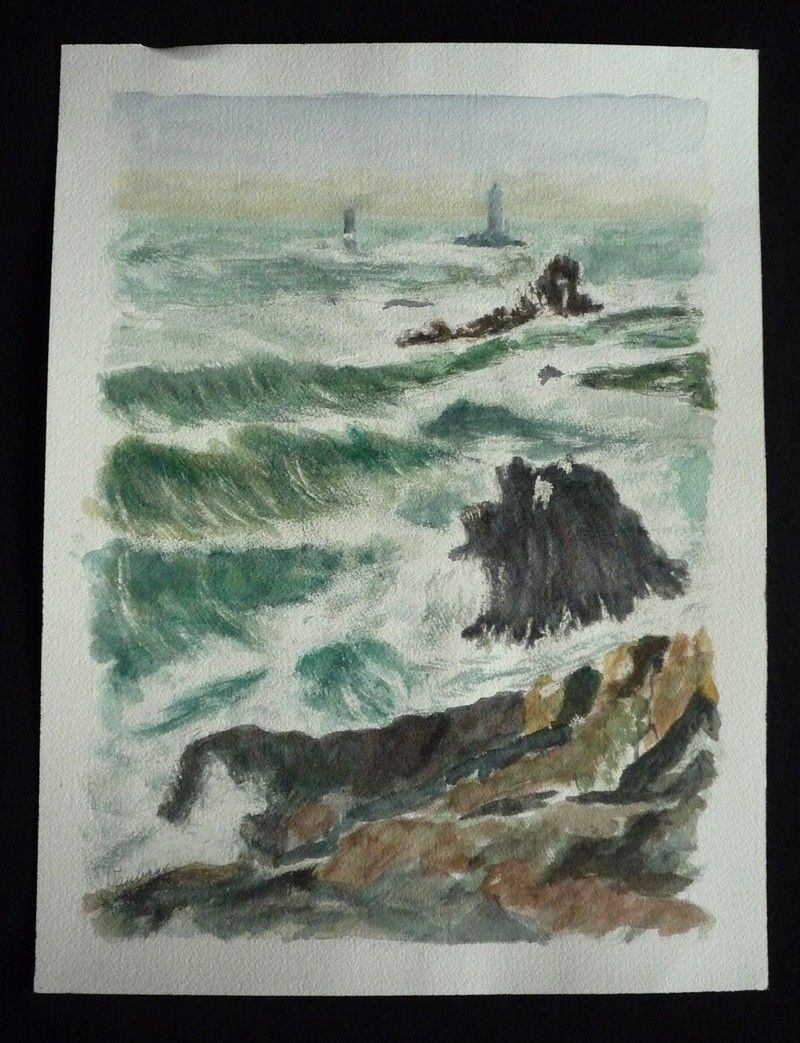 Aquarelle originale signée Vaubourg (27 x 36 cm, sur support 30,9 x 40,8 cm), représentant une mer agitée à la pointe du Raz (Finistère) ; très bel état.