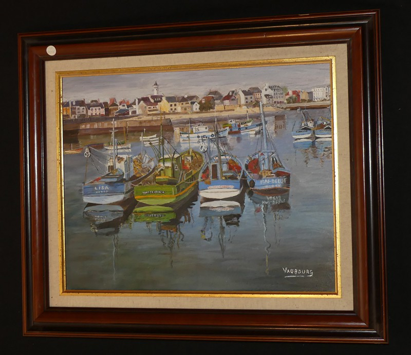 Belle peinture originale sur bois signée Vaubourg (41 x 32,2 cm) représentant le port d'Auray (Morbihan), avec un cadre ouvragé (54,2 x 46 cm) en bois, toile et liseré doré ; quelques petits incidents sur le cadre, le système de maintien du cadre est à restaurer et ne maintient plus la peinture en place, par ailleurs assez bon état.