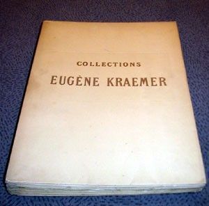 In-folio broché, 222 pp., plus de très nombreuses planches reproduisant les oeuvres en vente, catalogue posthume de la collection Eugène Kraemer, contenant des tableaux de Van Eyck, Rubens, Boucher, Meissonier, entre autres artistes, et de très nombreux objets d'art, avec la carte d'entrée à l'exposition particulière ; quelques incidents en couverture, bon état.