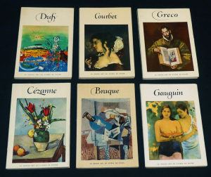 Six volumes petit in-12 broché ( 17 x 11 cm. ), les couvertures sont illustrées en couleurs, une trentaine de planches couleurs par album (dépliantes ou non), ce lot comprend les titres suivant : Dufy - Courbet - Greco - Cézanne - Braque - Gauguin, publiés dans les années 50 ; un peu jaunis, lot en bon état.