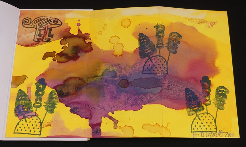 EDITION ORIGINALE. In-8 (12,7 x 21 cm), broché avec jaquette, 21 pages de texte sur fonds unis de couleur différentes, illustrations en noir et blanc dont deux en double page, 1 de 285 exemplaires numérotés, accompagné d'une AQUARELLE ORIGINALE rehaussée de tampons, signée et unique à cet exemplaire ; TRES BEL EXEMPLAIRE.