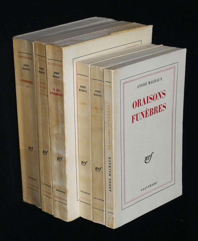 6 volumes brochés, 3 au format 18 x 12 cm. et 3 au format 21 x 14 cm., ce lot contient : Oraisons funèbres, 1971 - Hôtes de passage, 1975 - Lazare, 1974 - La Tête d'obsidienne, 1974 - L'Homme précaire et la littérature, 1977 - Antimémoires I, 1967 ; couvertures jaunies, intérieur frais, bon état.