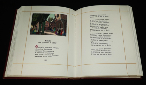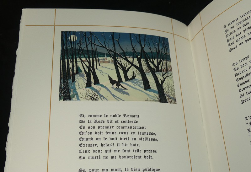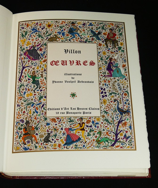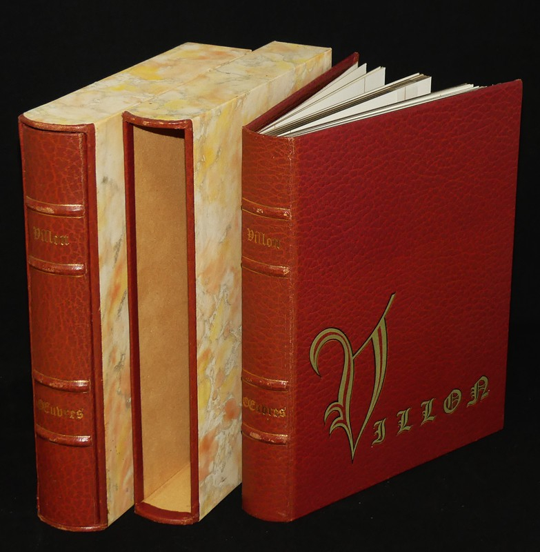 Ensemble de deux volumes in-8 (20 x 25 cm), comprenant un volume en sky vertex bordeaux, premier plat frappé du nom de Villon, dos imitant quatre nerfs, et un deuxième emboîtage, chemise à l'identique du volume joint mais proposant une suite des illustrations avec décomposition des couleurs ; ouvrage illustré sur le style des miniaturistes par Yvonne Vaulpré Debeauvais. Notre exemplaire, numéroté (n°243) est un des 190 exemplaires sur Grand Vélin de Rives (auquel est jointe une décomposition des couleurs) ; quelques frottements aux nerfs et mors, intérieur frais, bel état général.