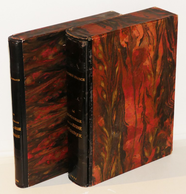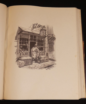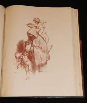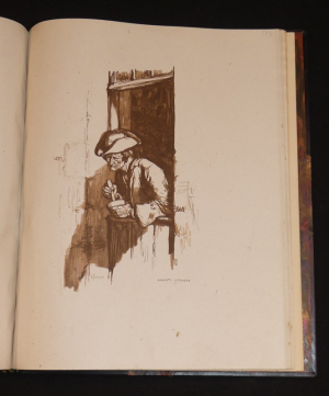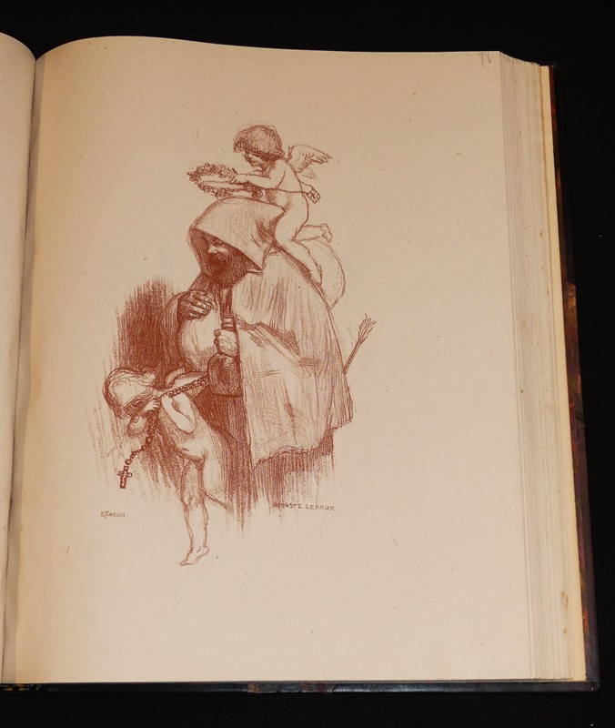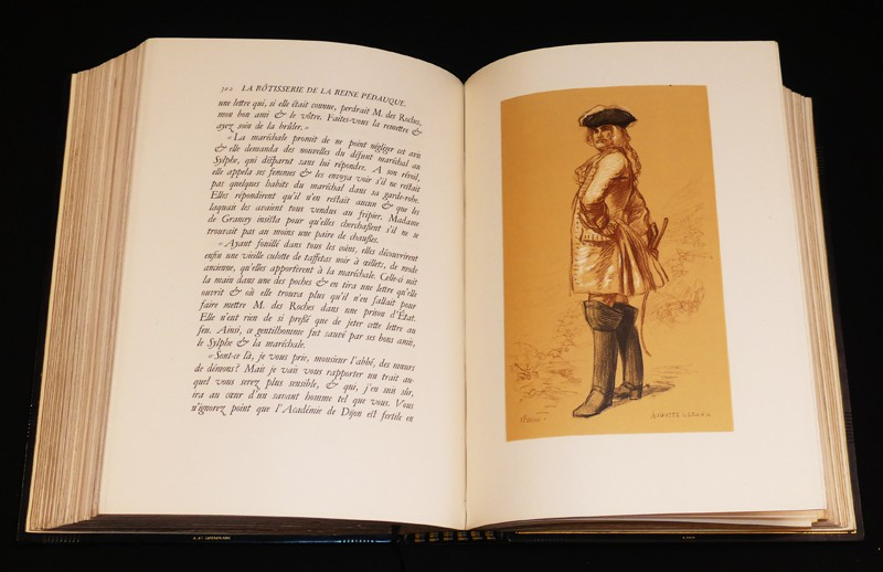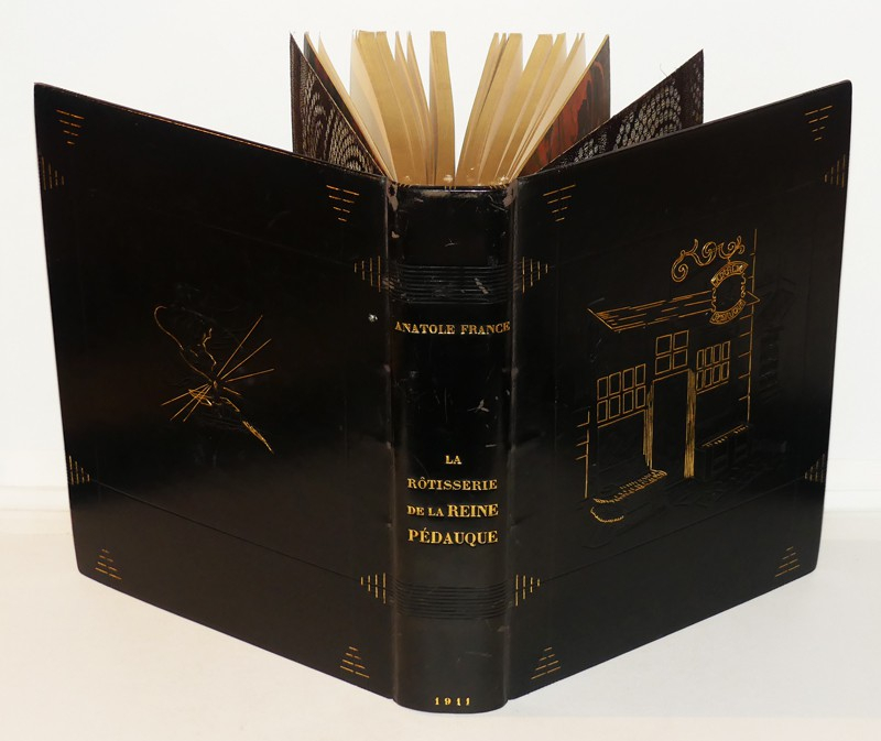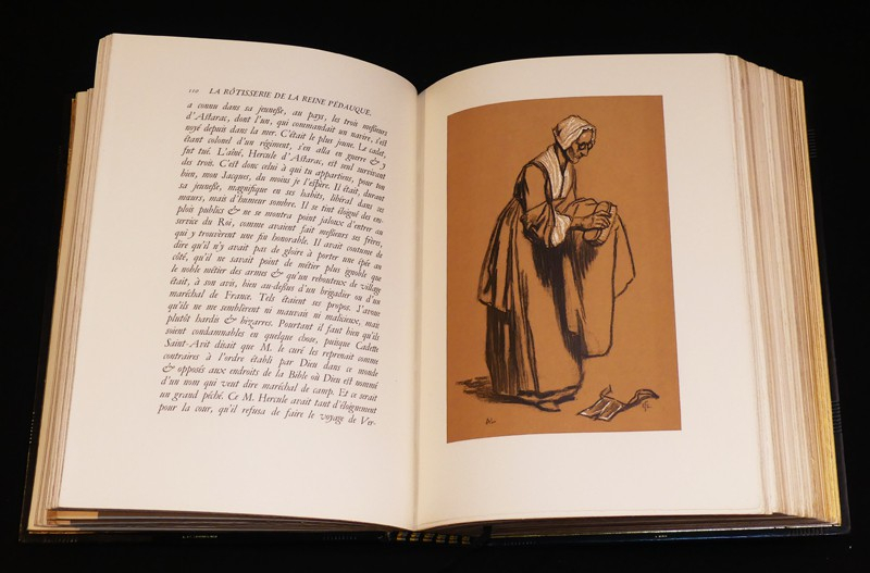 In-4 relié, box noir, le 1e plat porte une représentation en filets à froid ou dorés de la devanture de ladite rôtisserie, le 4e plat portant sur le même mode un encrier et une chandelle, roulette à froid sur les coupes, doublure de maroquin crème, gardes de soie havane foncé, avec décor floral, doubles gardes de papier marbré, tranches dorées, couverture et dos conservés, étui, reliure signée par Andrée et Jeanne Langrand, l'ouvrage est illustré de 174 compositions sur bois d'Auguste Leroux, dont 17 hors-texte, une suite tirée à part de ces compositions, sur Chine, est rassemblée dans un 2e volume relié en demi box noir à coin sous étui, avec décomposition des bois en couleurs, ainsi qu'une épreuve refusée d'un portrait de l'auteur, par ailleurs a été relié in fine le prospectus illustré de l'éditeur, tirage total, numéroté, à 444 exemplaires, le nôtre est un des 333 sur vélin du Marais ; dos du volume principal marqué de quelques traces ou très légères éraflures, ensemble rare, en très bel état.