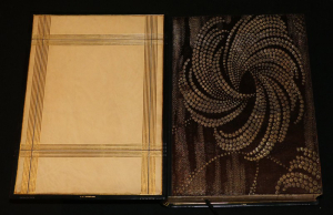 In-4 relié, box noir, le 1e plat porte une représentation en filets à froid ou dorés de la devanture de ladite rôtisserie, le 4e plat portant sur le même mode un encrier et une chandelle,...