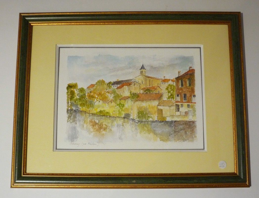 Aquarelle originale signée Vaubourg (28 x 20 cm dans un cadre de 44,5 x 34,5 cm) représentant le village de Sanxay en Poitou, joliment encadrée de bois vert et bronze ; deux petits incidents discrets au cadre, par ailleurs très bon état.