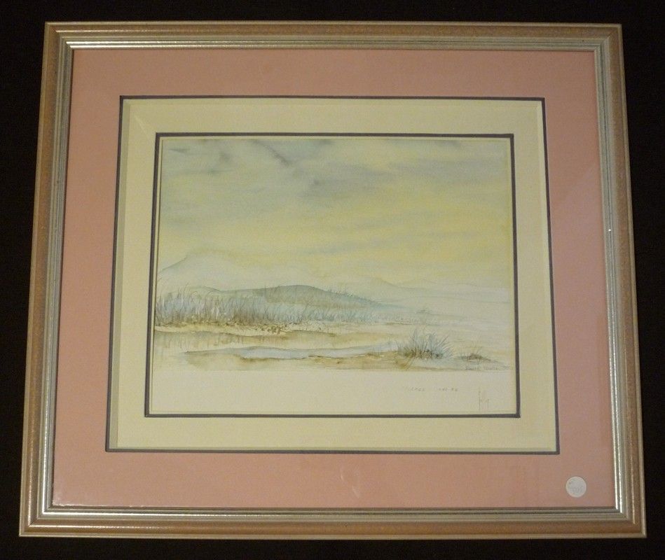 Aquarelle originale signée Vincent Toullec (27 x 21 cm dans un cadre de 45,5 x 39,5 cm) intitulée "Mirage", représentant une dune, joliment encadrée de bois aux tons rose et gris, avec double passe-partout blanc cassé et rose ; très bon état.