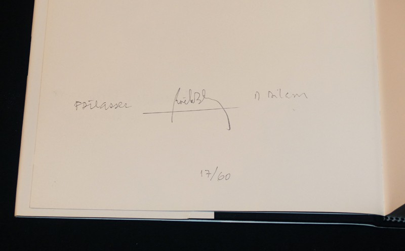 In-4 (22,5 x 27,5 cm), cartonné avec jaquette, 207 pages, 1 de 60 exemplaires numérotés et signés, avec envoi autographe de l'artiste sous l'envoi d'une autre personne (signature difficile à identifier) ; jaquette usée au niveau de la coiffe supérieure, par ailleurs bon état.