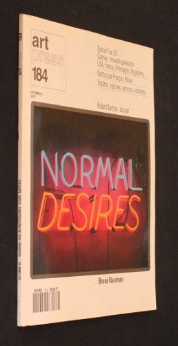 In-4 (22.5x28.5 cm), dos carré collé, 105 pages, plats illustrés, n°184 de la revue mensuelle 'Art Press', octobre 1993, ouvrage épuisé ; Spécial FIAC 93, Balthus, Roland Barthes, théâtre, etc., illustrations en noir et blanc dans le texte ; coiffes à peine frottées, plats légèrement frottés, bel état.