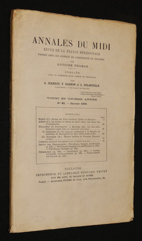 In-8 (16x25 cm), broché non coupé, Annales du midi, revue de la France méridionale, n°81, janvier 1909 (21e année), 152 pp., ouvrage collectif ; petites fissures au dos frotté, coiffes frottées, petites taches au 4e plat, bon état.