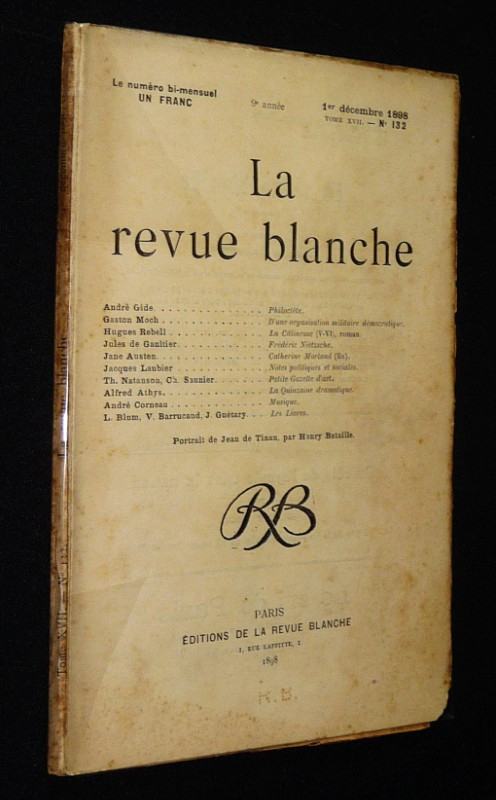 In-8 (16x25 cm), broché, tome XVII n°132 de la revue bi-mensuelle 'La Revue blanche', 1er décembre 1898, 9e année, contient l'édition originale de 'Philoctète' d'André Gide, un portrait de Jean de Tinan par Henry Bataille ; pliures au dos usé et roussi, coiffes frottées, quelques rares rousseurs au premier plat, bon état.