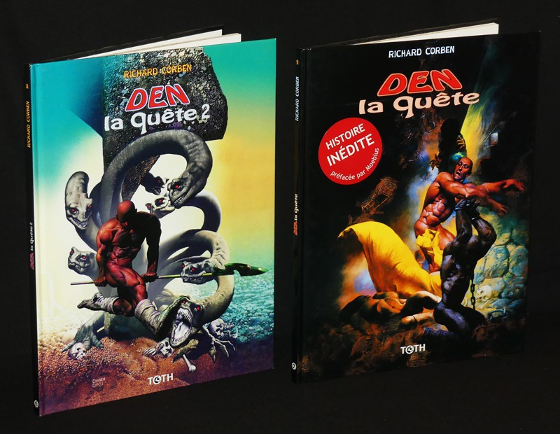 Deux volumes in-4 (22,6 x 30,2 cm), albums cartonnés, Tomes 1 et 2 de "Den : La Quête", 44 et 52 pages, dépôt légal 1999 et 2000 ; quelques frottements aux plats, typiques du papier reliure noir brillant, par ailleurs bon état.