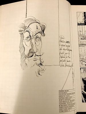 In-4 (24 x 32 cm), album cartonné, premier plat illustré en couleur, non paginé, environ 40 pages, édition originale de cet one-shot fantastique en noir et blanc, album dédicacé en regard de la 1ère planche de Bézian ; réparations au ruban adhésif à cheval sur les coiffes, petit incident au bord du 4ème plat en queue, plats un peu défraîchis, pelliculage légèrement effrité aux mors, ex-libris à la page de titre, assez bel état.