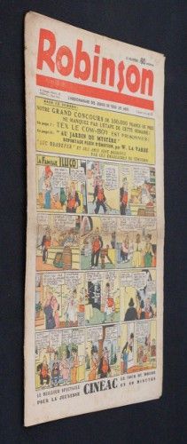 In-4 (27x38 cm), journal illustré, 'Robinson', 'hebdomadaire des jeunes de tous les âges', n°38, 17 janvier 1937 (2e année) ; dos légèrement frotté, rousseurs sur les pages jaunies, menues déchirures sur les bords, assez bon état.