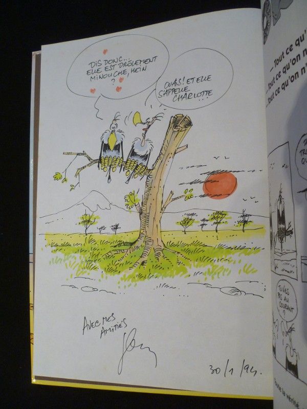 In-4 (22 x 30 cm.), album cartonné, couverture illustrée, 47 pages, vignettes couleurs, dessin couleurs de Glem en dédicace ; très bon état.