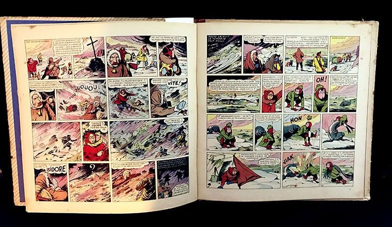 In-4 (27,6 x 29 cm), album cartonné, gardes illustrées, 47 pages, vignettes en couleurs ; dos passé, coupes et bords frottés, des marques d'usage aux plats défraîchis, rousseurs aux plats, assez bel état général.