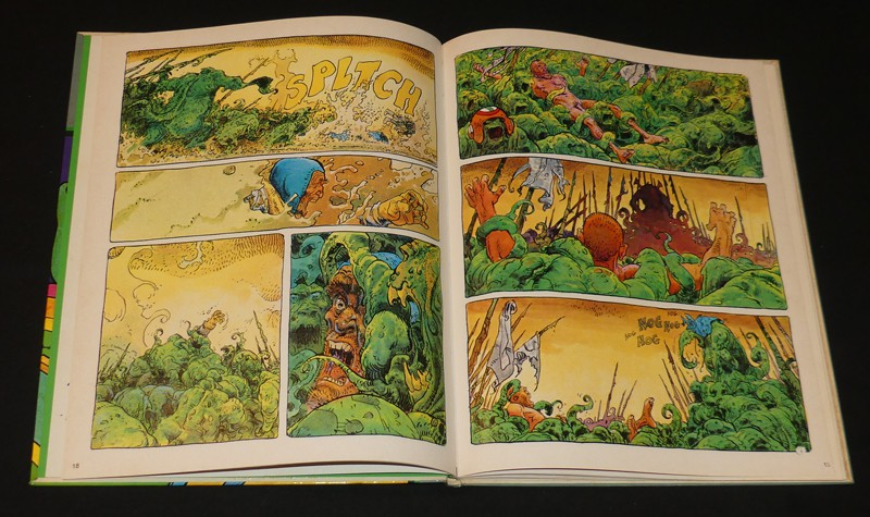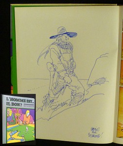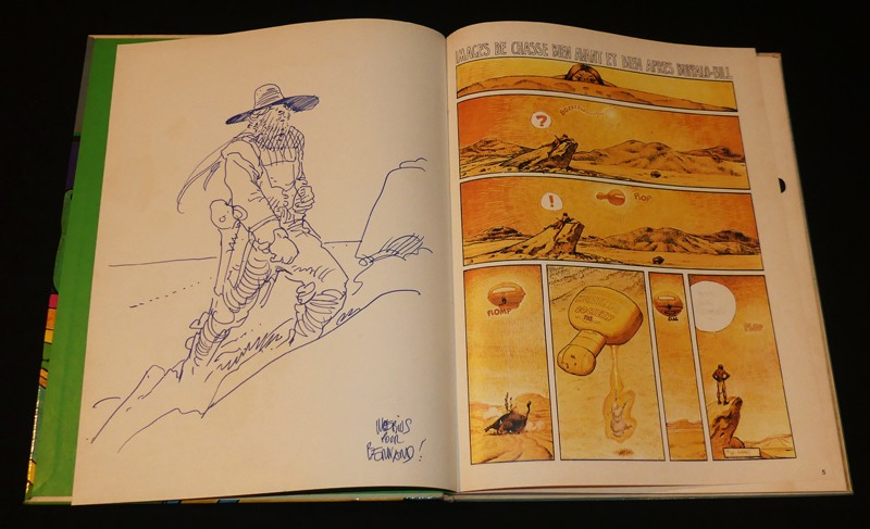 ENVOI ET DESSIN ORIGINAL SIGNÉS PLEINE PAGE DE MOEBIUS. Album de bande dessinée in-4 (23 x 29,5 cm) cartonné, couverture illustrée couleurs, 62 pages, ÉDITION ORIGINALE collective de ces histoires signées par le très grand Moebius. Notre exemplaire présente un ENVOI AUTOGRAPHE SIGNÉ : 'Moebius pour Bernard' (il s'agit de Bernard Farkas, un des quatre Humanoïdes Associés participant au départ de 'Métal Hurlant'), DESSIN PLEINE PAGE au feutre, représentant un aventurier au grand chapeau gravissant une colline. TRÈS BEAU DESSIN DE MOEBIUS.