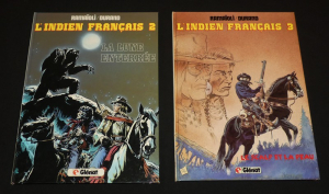 Cinq volumes in-4 (21,7 x 29,6 cm), albums cartonnés, les 5 premiers albums de "L'Indien français", tous dédicacés par les auteurs, dont un croquis de Ramaïoli dans chaque volume ; Tome 1 : L'Indien français (édition de 1985) ; Tome 2 : La Lune enterrée (1986) ; Tome 3 : Le Scalp et la peau (1982) ; Tome 4 : Traques (1984) ; Tome 5 : Le Chasseur des solitudes (1985) ; dos du tome 3 bruni, légère trace au premier plat du tome 4, par ailleurs bel état général.