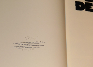 In-folio (30 x 40 cm), album cartonné sous emboîtage muet, 86 pages, 1 des 750 exemplaires numérotés et signés par Tardi ; emboîtage légèrement fragilisé, par ailleurs le livre lui-même est en très bon état.