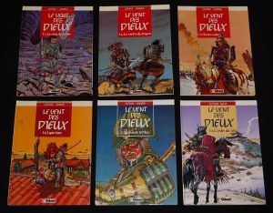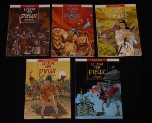 Onze volumes in-4 (21,5 x 29,2 cm), albums cartonnés, tomes 1 à 11 de la série "Le Vent des Dieux" en édition originale (1985-1996) : 1. Le Sang de la Lune // 2. Le Ventre du dragon // 3. L'Homme oublié // 4. Lapin-tigre // 5. La balade de Mizu // 6. L'Ordre du ciel // 7. Barbaries // 8. Ti Fun // 9. Cambaluc // 10. Le Gherkek // 11. Cogotaï ; dos plus ou moins brunis selon le volume, par ailleurs bel état.