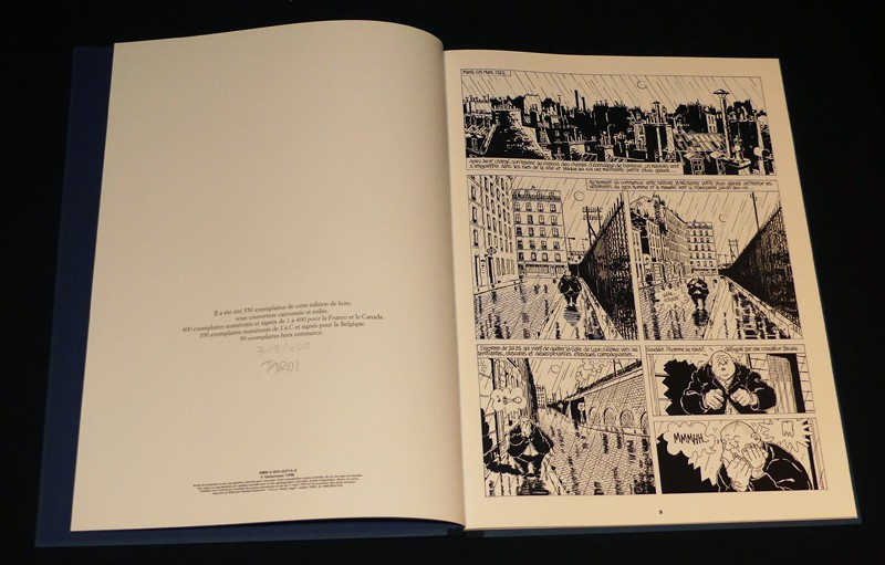 In-folio (30 x 40 cm), album cartonné sous emboîtage muet, 86 pages, 1 des 400 exemplaires numérotés et signés par Tardi ; petite épidermure papier au quatrième plat, par ailleurs bon état.
