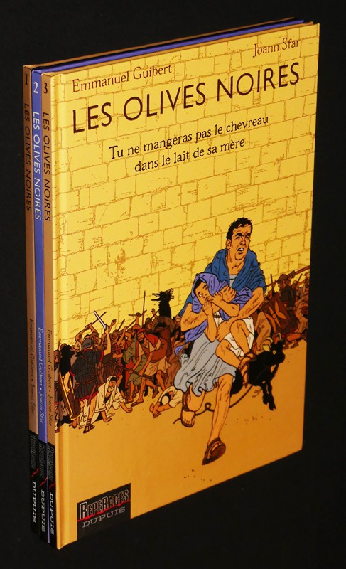 Trois volumes in-4 (21,7 x 30 cm), albums cartonnés, série "Les Olives noires" complète ; T1 : Pourquoi cette nuit est-elle différente des autres nuits ? (2001) // T2 : Adam Harishon (2002) // T3 : Tu ne mangeras pas le chevreau dans le lait de sa mère (2003) ; quelques petits frottements aux plats, par ailleurs très bon état général.