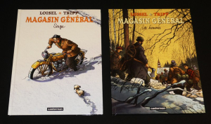In-4 (23,9 x 32 cm), albums cartonnés, ensemble complet de la série "Magasin général" en 9 tomes, dont 6 en édition originale ; T1 : Marie // T2 : Serge // T3 : Les Hommes (EO) // T4 : Confessions (EO) // T5 : Montréal // T6 : Ernest Latulippe (EO) // T7 : Charleston (EO) // T8 : Les Femmes (EO) // T9 : Notre-Dame-des-Lacs (EO) ; quelques marques de frottements aux quatrièmes plats typiques des couvertures en papier noir brillant, éraflures au quatrième plat du tome 6, par ailleurs bel état général.