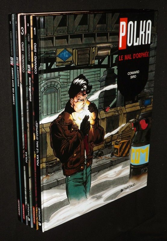Cinq volumes in-4 (24 x 32 cm), albums cartonnés, série "Polka" complète : Tome 1 : Le Mal d'Orphée (édition 1999) // Tome 2 : DémoKratie (2002) // Tome 3 : A.D. Haine ! (1998) // Tome 4 : Philosoft (2000) // Tome 4 : Lobby or not lobby (2005) ; choc et déchirure au papier reliure sur le bord supérieur du premier plat du tome 5, par ailleurs bon état général.