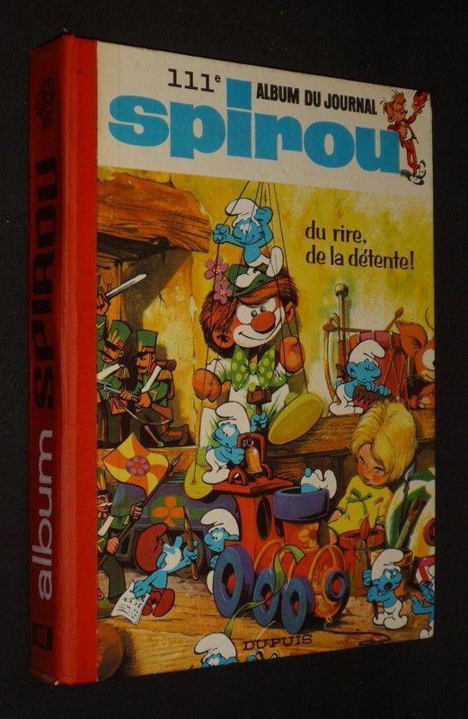 In-4 (20,5 x 27,5 cm), album cartonné, 1er plat illustré, album n°111 du journal Spirou, comprenant les numéros 1590 à 1602, complet des mini-récits et suppléments ; coupes et coins du quatrième plat usés, manque au papier reliure et incident au cartonnage au quatrième plat, deux numéros dégrafés, notes manuscrites et traces au feutre au dos de la première garde, en regard du premier numéro, par ailleurs assez bon état général.