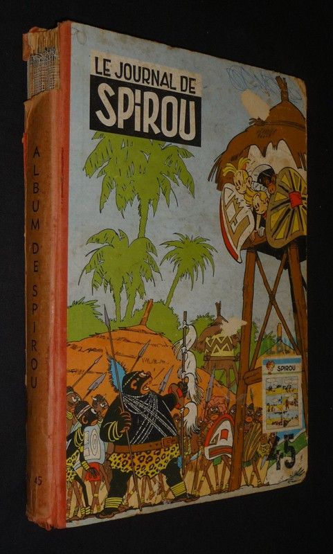 In-4 (19,5 x 28,5 cm), album cartonné, 1er plat illustré, album n°45 du journal Spirou, comprenant les numéros 781 (2 avril 1953) à 793 (25 juin 1953) ; manque au dos en tête, coupes usées, petit manque de papier reliure sur chaque plat, tache au quatrième plat, gribouillage dans le coin supérieur du premier plat, trois numéros désolidarisés, en l'état.